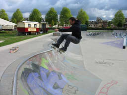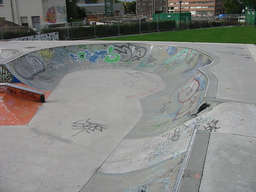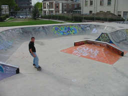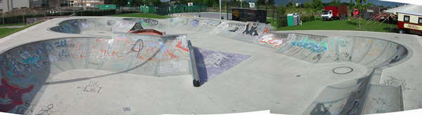 Etwas älterer Betonbowl, gebaut von Carve. Die Schüssel besteht aus Beton Fertigteilen, von der Idee des Designs ein guter Ansatz, leider aber zum Großteil verpusht. Speziell die zwei Street-Elemente, diese zwei Pyras stören den Flow, wenn man durch die Schüssel heizen will. Das Flat ist teilweise zu lang, das Coping grindet und slidet kaum, weil es aus Edelstahl ist, und die Betonoberfläche ist hier und da recht rauh, ist also nicht ganz einfach Speed aufzubauen. Wie so oft wurde da 'ne Menge Geld zum Fenster rausgeschmissen. Man kann das Teil schon shredden, man findet diverse Lines, und und für 'ne Session auf jeden Fall 'ne spaßige Sache. Trotzdem schade, könnte und sollte besser sein.