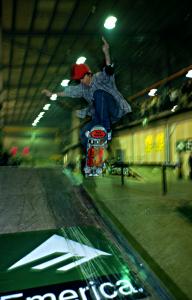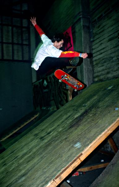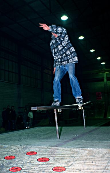 Ja, wirklich ein angenehmer Sonntag. Die Sonne schien, und die Vorfreude einen Contest auf hohem Nivau miterleben zu dürfen prickelte in meinen Knochen. Es war der Tag der Schweizer Meisterschaft 2001, ausgetragen in der Landihalle zu Basel. Zahlreiche Skater tummelten sich auf dem Streetparcours und die Seiten waren gesäumt von Zuschauern. Man mußte auch nicht lange auf den ersten Höhepunkt warten,kaum in der Halle schon stürzte sich der waagemutiger Ivan Spoti aus Lugano von der gut 4-5 Meter hohen Thaiboxhalle gen Erde, und das ganze drei erfolglose mal hintereinander. Krach machte es und das Deck war beim letzten Mal entzwei. Und schon ging es los mit den hoffnungsvollen Nachwuchstalenten, die alles gaben. Die Nervosität war allgegenwärtig und verursachte so manchen Bail. Zwischen den Elimination- und Finalläufen merkte man am deutlichsten, wie viele Teilnehmer da waren. Jeder versuchte noch einmal ein bisschen an seinen Tricks zu feilen, so dass ein heilloses Gewusel zwischen den Obstacles herrschte.