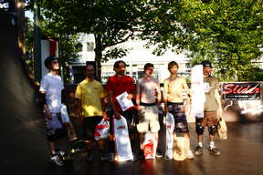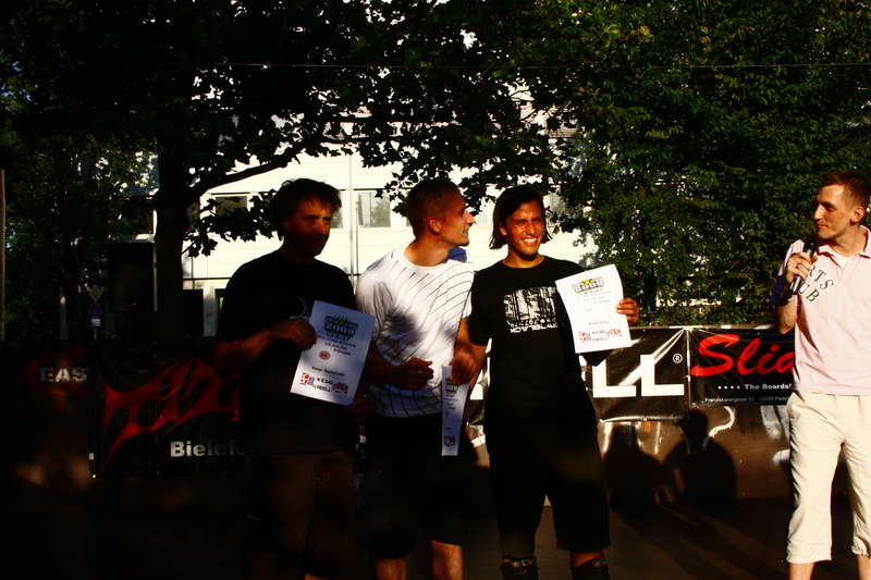 Na, das hat ja geklappt. mein erstorganisierter Contest. Schade, dass die A-Gruppen-Fahrer nicht so zahlreich erschienen sind. Ich danke an dieser Stelle dem Kongo und dem Rudi, cool dass ihr da wart. In der B-Gruppe hatten wir 10 Starter, nach der Vorentscheidung in 2 Heats haben wir dann ein Finale mit 6 Fahrern gefahren. Von Inverts in verschiedenen Versionen von Thorsten "Toto" Müller (FS-Invert in der Quali) bis schulterhohe One-Foots von Kai Schuller war alles dabei. Im Ganzen hat der Contest 3 Stunden gedauert. In der A-Gruppe sind der Kongo, Rudi und ich eine Jam gefahren. Kongo hatte ein wenig Probleme von einer 20-Meter-Rampe sich auf eine 9-Meter-Rampe umzustellen. Nächstes Jahr am besten einen Tag früher kommen. Ich denke die Ergebnisse gehen in Ordnung. Auf jeden Fall wird es 2010 in Bielefeld wieder einen Vert-Contest geben.
