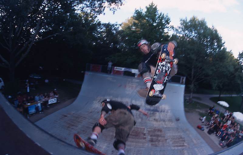 Dann waren da noch die Busam-Brüder Sven und Steffen, denen ich ja vorhin schon den Punkrock-Skating-Award verliehen hatte: Die Jungs sind einfach krass! Lien-to-Tails (aber wie!), Sack-Taps, Frontside_Standup-Grind-Nose-Grab, Inverts, hohe Airs-to-Fakie, Blunt-Nose-Grab und irgendwie den Fuß ums Board drehen; einfach nur geiles Skatesn im Doppelpack!